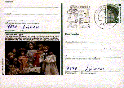 PuppenmuseumWerteindruck: 80 Pf SehenswürdigkeitenAuflage: 20.000 Datum: 2.93 Abbildung: Puppen aus dem Museum Text: Das städtische Museum im alten Wirtschaftsgebäude vom Schloss Schwansbell zeigt eine bedeutende Puppen- und Spielzeugsammlung und Wohnkultur des 19. und 20. Jahrhunderts. |